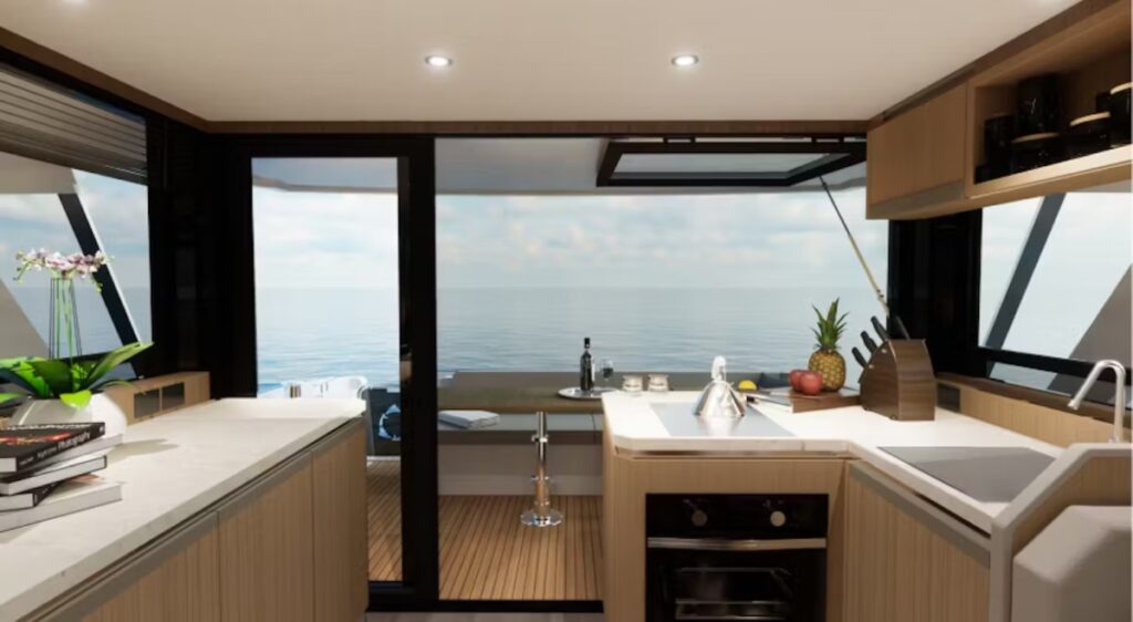 Új közösségi terek jelentek meg a fedélzeten, ezek leginkább szembetűnő eleme a Greenline 58 ihlette orrfedélzeti társalgó. A hátsó kokpit két konfigurációban érhető el, rugalmasságot kínálva olyan funkciókkal, mint a lehajtható fartükör, a leengedhető úszóplatform és az opcionális kivehető bútorok. Casali belülre három stíluscsomagot tervezett, amelyek természetes tónusok és megújuló anyagok köré épülnek, olyan elemekkel, mint a mézszínű teak és a modern tölgyfa felületek. A tulajdonosok több elrendezési lehetőség közül választhatnak (második fürdő, gardrób, fésülködőasztal a tulajdonosi lakosztályban): „A Greenline 42 izgalmas kihívást jelentett számunkra. Célunk az volt, hogy a többi modell sikerére építve még több kényelmet biztosítsunk a fedélzeten, és olyan modern formát alkalmazzunk, amely egyúttal őrzi időtlen vonalainkat is. A leginkább forradalmi változást a szalon teljes üvegfala jelentette, amely intenzív kapcsolatot teremt a kokpit és a szalon között.”