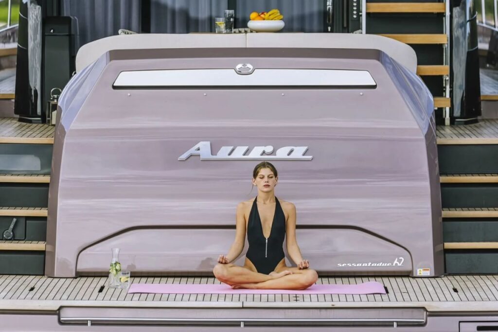 Eltűnni látszik a kokpit és a szalon közötti határ: a dupla tolóajtó mindkét oldalán a padlót és a mennyezetet is teakfa borítja, ami egyetlen nagy veranda benyomását kelti. A beltérben és az alsó fedélzeti szinten a teakfa felületek remek összhangban vannak a világos lakk felületekkel, valamint a berendezési és világítási megoldásokkal: egységük kellemes hangulatot teremt és nyugodt eleganciát áraszt.