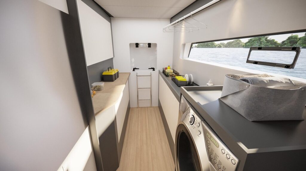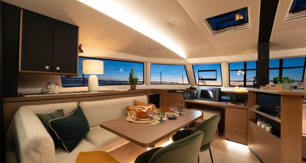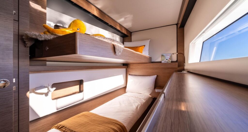 Többtestű kategóriában a Nautitech 48 Open nyert, elsősorban nyitottságának köszönhetően. És ez a nyitottság többféleképpen is értelmezhető. Először is, ott van a két kormányállás a fartükrök közelében, a szabad ég alatt, ahol érezhetjük a szelet az arcunkban, és hallhatjuk a víz zúgását a hajótestek mellett. Aztán ott van a hajó nyitott érzete, különösen a szalonból a kokpitba vezető úton. Itt a berendezési tárgyak elég minimalisták ahhoz, hogy a tér ne tűnjön zsúfoltnak, ugyanakkor kifinomult megjelenéssel rendelkezzen. És végül az építő által opcionális „okosszobának” nevezett rész (jobb oldali elülső kabin), amely szabadon alakítható, a tulajdonos igényei szerint. Lehet benne egy franciaágy, vagy két kihajtható, esetleg háztartási helység mosógéppel, szárítógéppel és rengeteg tárolóhellyel.