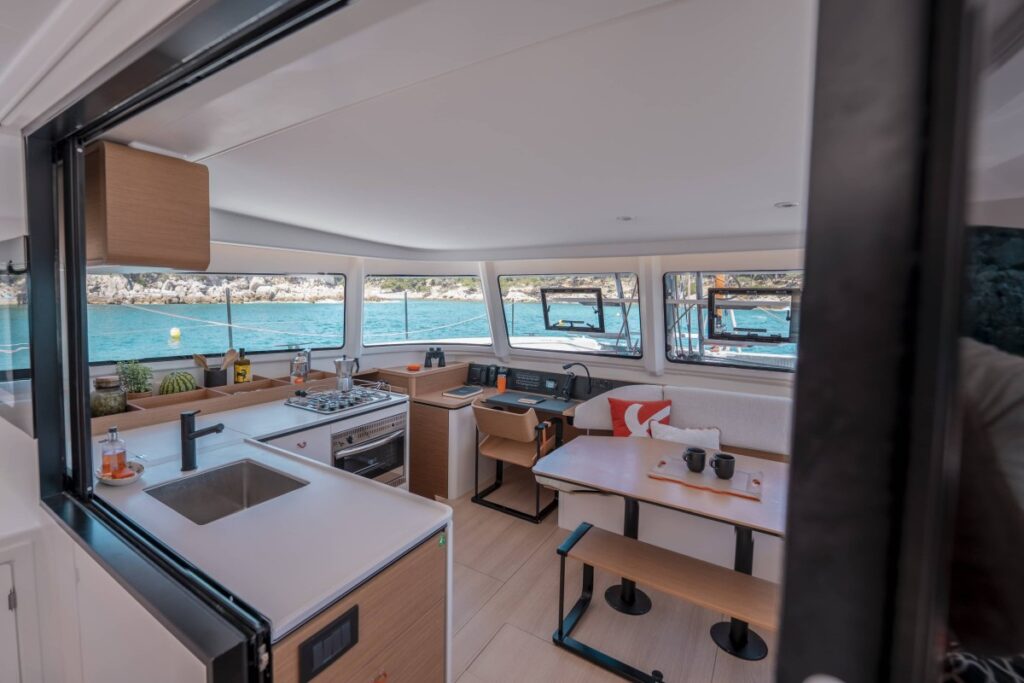 A hajótestek belső berendezései a szokásos változatosságot kínálják: alap a tulajdonosi verzió, három kabinnal és három fürdővel, ilyenkor a jobb oldali hajótest tágas és nyitott lakrész, nagy irodahelyiséggel, rengeteg tárolóhellyel és nyitott könyvespolcokkal. A bal oldali hajótest mindig két kabinnal és két fürdővel van felszerelve, ezek közös zuhanykabint használnak, amely mindkét oldalról megközelíthető. A két kabinos hajótest dupla fekhelyeinek mérete is figyelemre méltó, az elsőben az ágy 1,90 méter széles a vállaknál, míg a hátsó szobában 1,60 méter széles szigetágy található.