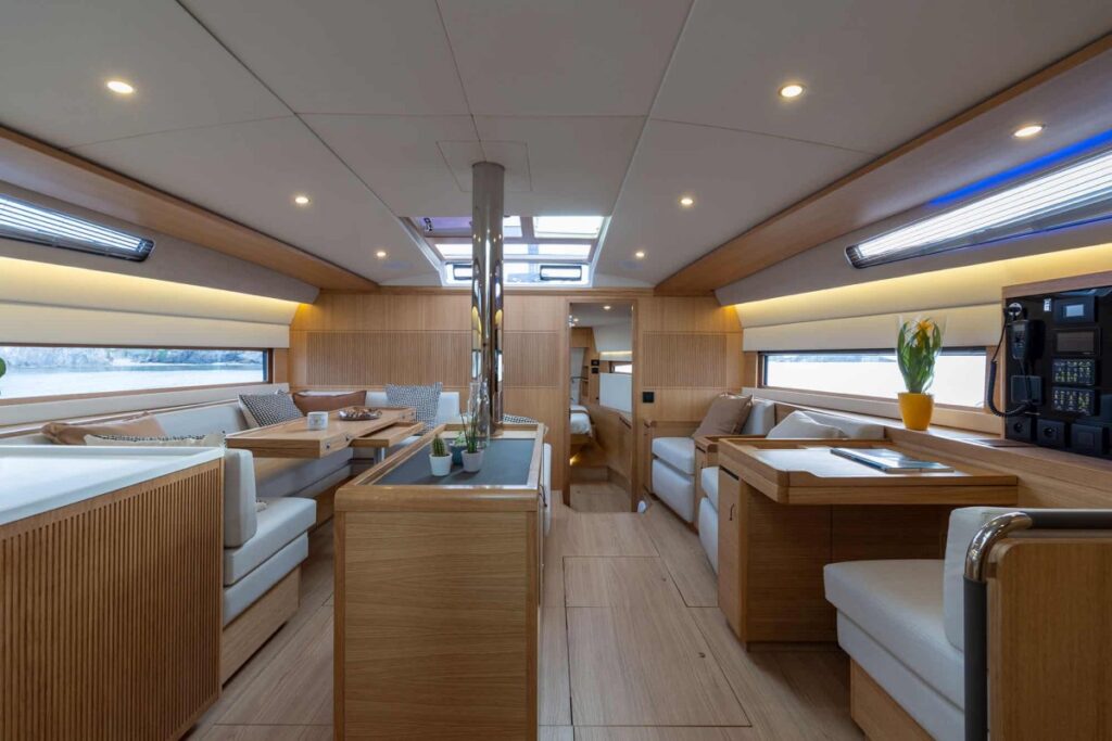 A francia Roseo Design stúdió által tervezett belső tér két elrendezésben rendelhető: a Proprietaire és a Grand Voyageur közötti különbség, hogy utóbbi kevésbé tágas tulajdonosi kabint és több tároló/műszaki területet kínál. Figyelemre méltó a zaj és a nyikorgás teljes hiánya menet közben, ami fontos szempont, és kiemeli a konstrukció minőségét. A három kabin mindegyikéhez tartozik saját fürdőszoba, míg a konyha a szalon és a tulajdonosi lakosztály közötti teljes teret kihasználja, amibe jelentőshűtőkapacitás is belefér: 130 literes hűtőszekrény fagyasztóval, 80 literes fiókos hűtőszekrény és 64 literes fagyasztó.