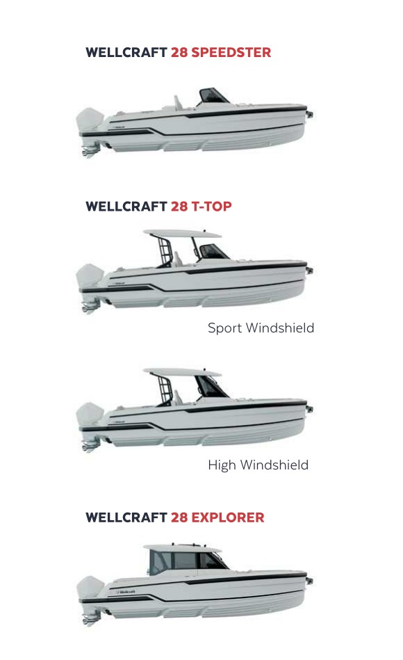 Bár a Wellcraft 28 hivatalos bemutatójára még várni kell, a gyártó már bejelentette, hogy a modell három verzióban – Speedster, T-Top, Explorer – lesz kapható.