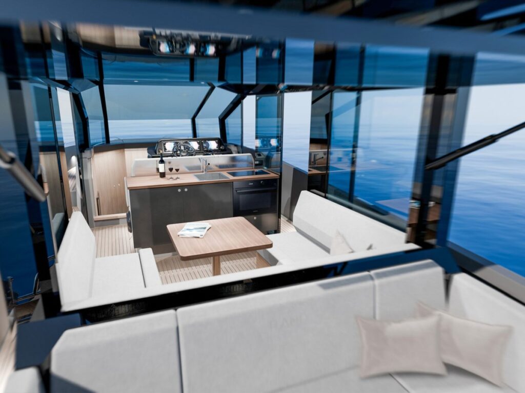 Mivel a dupla, oldalsó tolóajtó az oldalsó mellvéd lehajtható része mellett kapott helyet, tovább javítva a kilátást és létrehozva egy mini erkélyt. Két további tolóajtó található a jobb oldalon, az egyik a kormánynál, a másik a konyhánál, ami fokozza a természetes szellőzést. Lent, az alsó fedélzeten egy dupla kabin található elöl (jobb oldalon WC-vel és zuhanykabinnal), valamint a kokpit alatt két egyszemélyes ággyal felszerelt helységgel (utóbbi tárolóként is kérhető).