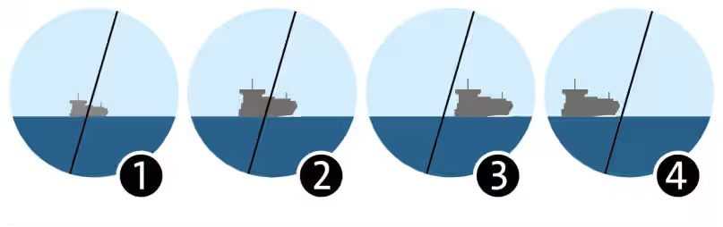 Mérje fel a közeledő hajó irányszögét valamilyen fix pont (például ablakkeret) alapján (1-es kép), majd néhány perc elteltével ismételje meg az első lépést. A 2-es képen vázolt helyzetben Ön ütközési pályán van a megfigyelt hajóval, és lépnie kell. Ha az ismételt irányszögek a 3-as vagy 4-es képen látható módon változtak, nincs veszély. Az első esetben Ön előtt, a másodikban Ön mögött fog áthaladni a figyelt jármű. Azonban érdemes továbbra is óvatosnak lenni, figyelni mivel a másik hajó bármikor megváltoztathatja a sebességét vagy az irányát.