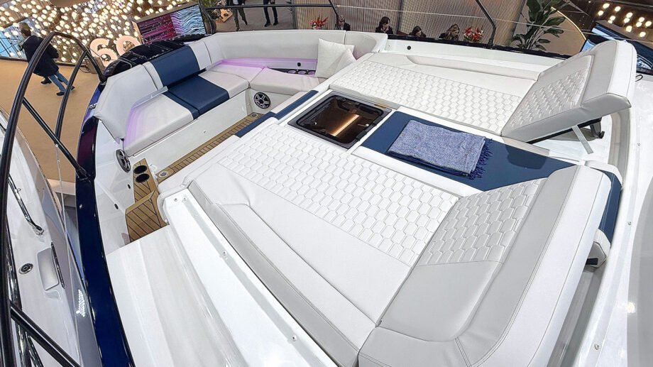 És akkor ott van még az orrfedélzet, ahol a napozóágyak előtt helyett kapott még egy elegáns, süllyesztett ülősarok is… A két kokpitot természetesen zárt fedélzeti szalon köti össze, de ez viszonylag rövid, hátsó felének nagy részét a konyha foglalja el – meg a kokpitra néző bárpult. Szigorúan véve az egyetlen beltéri ülőhely tulajdonképpen csak a kompakt, C alakú kanapé a kormányállás mellett.