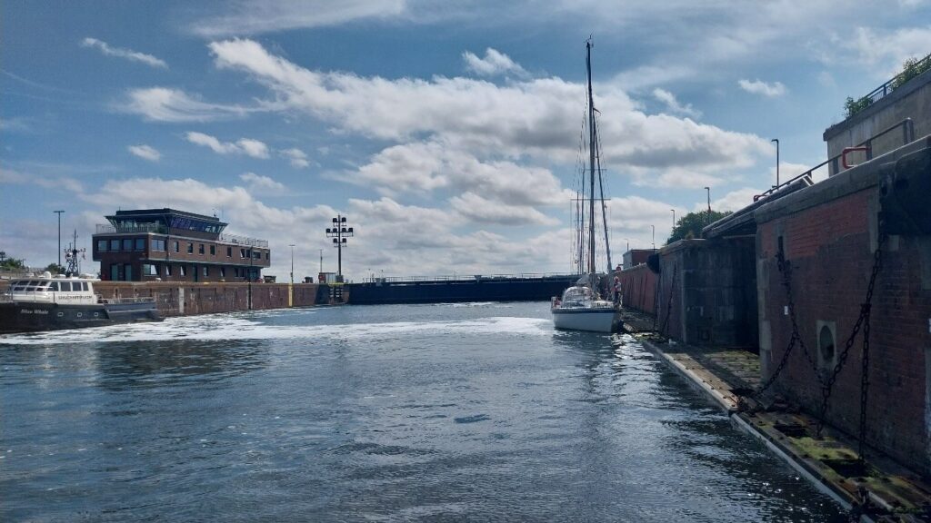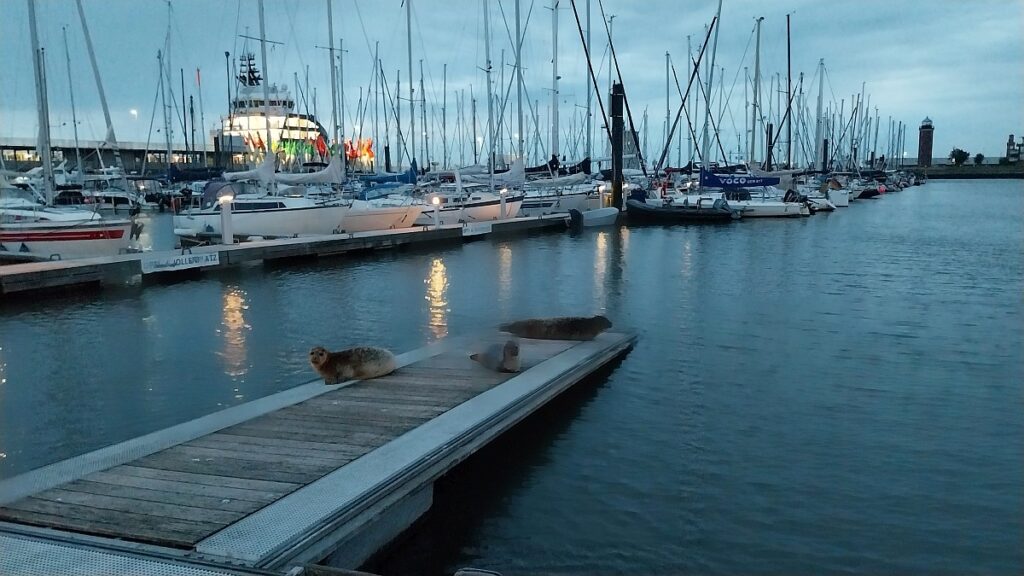 A cuxhafeni kikötő megközelítése nem zajlott teljesen dráma nélkül: az Elba torkolatánál, ahova a zsilip nyílik, a folyásirány 6 óránként megfordul az Északi-tenger árapálya miatt. Egy olyan géperővel rendelkező hajónak, mint a miénk, el kell találni azt a zsilipnyitást, ami az apályra enged ki, lehetőleg az elején, különben esélye sincs elérni Cuxhafent az erős szembeáramlás miatt. És közben az áramlás sebessége is változik… eleinte nagyon nehezemre esett átengedni a kormányt a többieknek, mert mi van, ha nem tudunk bemenni Cuxhafenbe? Nem kell hozzá sok, csak a kikötő előtt egy nagyhajó szemből: túlszaladunk, és az erősödő áramlással szemben nem fogok tudni visszamenni a kikötőig… ilyen gondolatok jártak a fejemben, miközben próbáltam élvezni az utazást, és nem halálra ijeszteni a többieket. Amikor ráfordítottam a hajó orrát a kikötő szájára, olyan mértékű sodródást tapasztaltunk, mint soha korábban. A végén behúzott vitorlákkal, a motort alapjáraton pörgetve, 7,5 csomós sebességgel drifteltünk be a kikötő száján, hogy aztán gyors ellenkormányzással kompenzáljuk a megszűnő sodrás hatását.